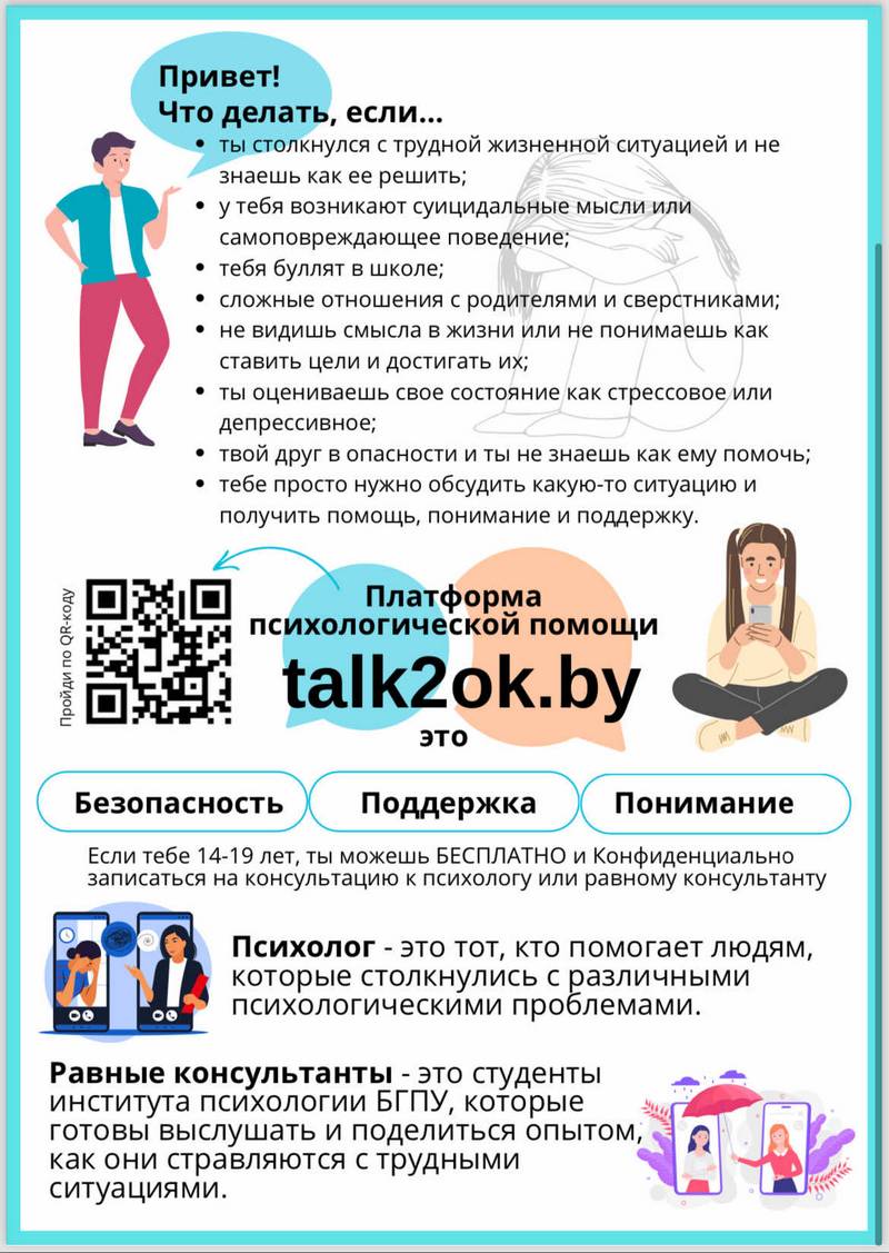 В Республике Беларусь для оказания психологической помощи подросткам создана интернет-платформа Talk2ok.by. Она предназначена для предоставления психологической поддержки несовершеннолетним в период подросткового кризиса, когда они сталкиваются со множеством стрессовых факторов и не всегда могут с ними самостоятельно справиться.
